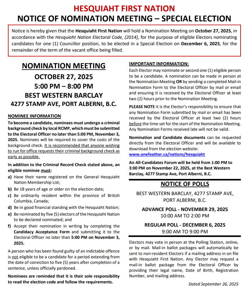 Notice is hereby given that the Hesquiaht First Nation will hold a Nomination Meeting on October 27, 2025, in